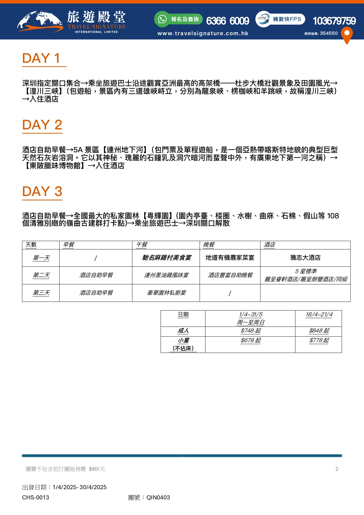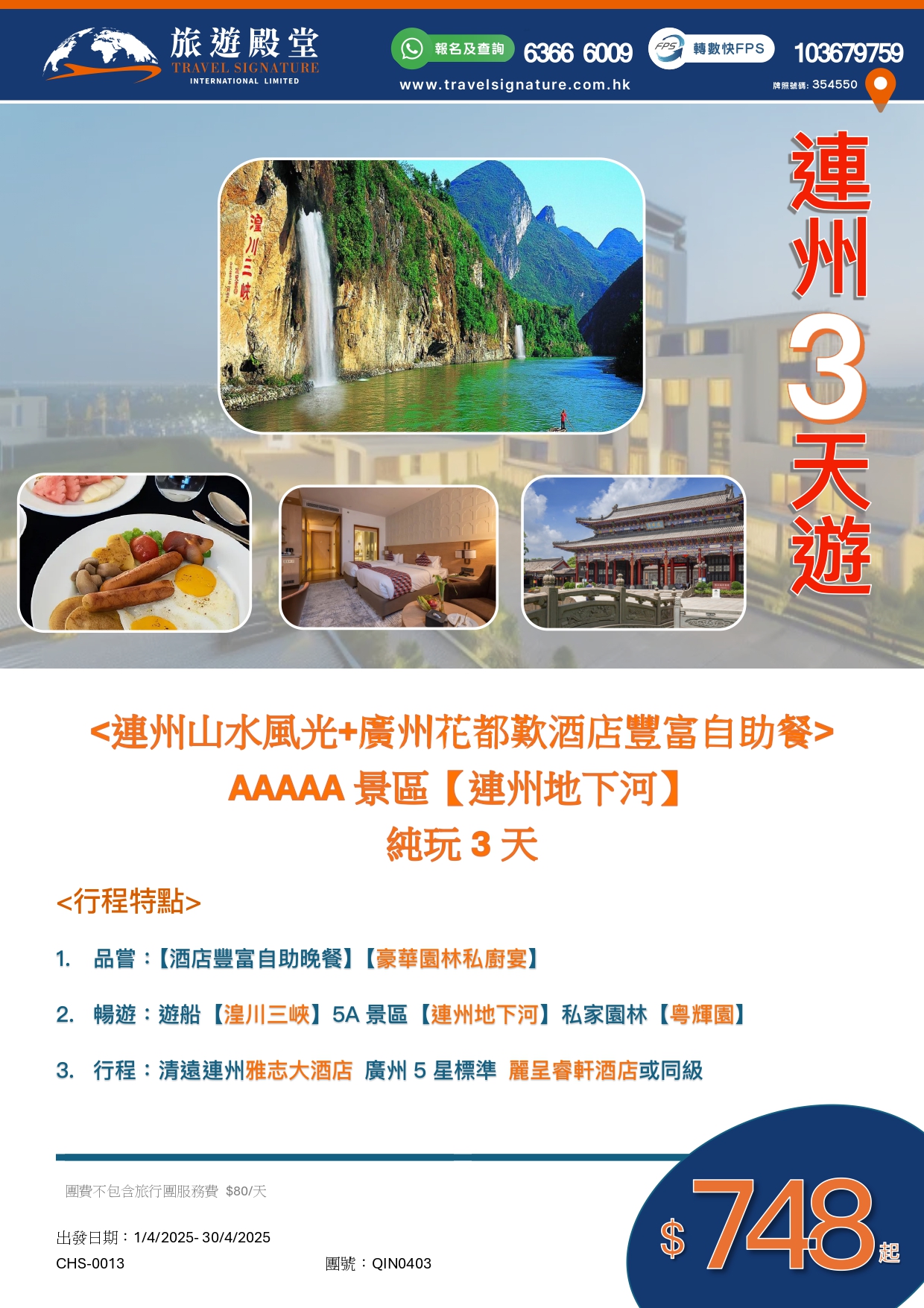 <行程特點> 1. 品嘗:【酒店豐富自助晚餐】【豪華園林私廚宴】 2. 暢遊:遊船【湟川三峡】5A景區【連州地下河】私家園林【專輝面】 3.行程:清遠連州雅志大酒店 廣州5星標準 麗呈書軒酒店或同級